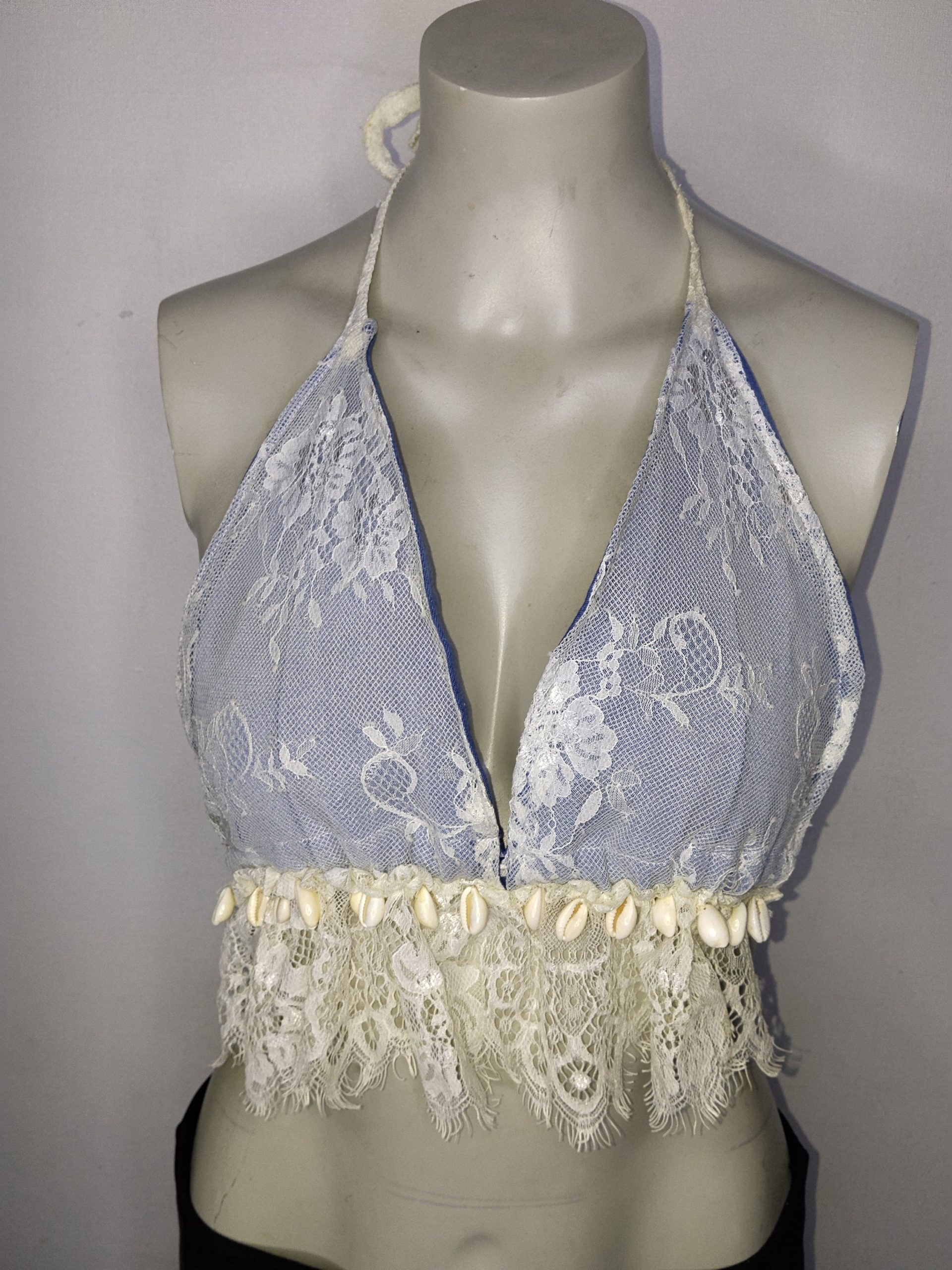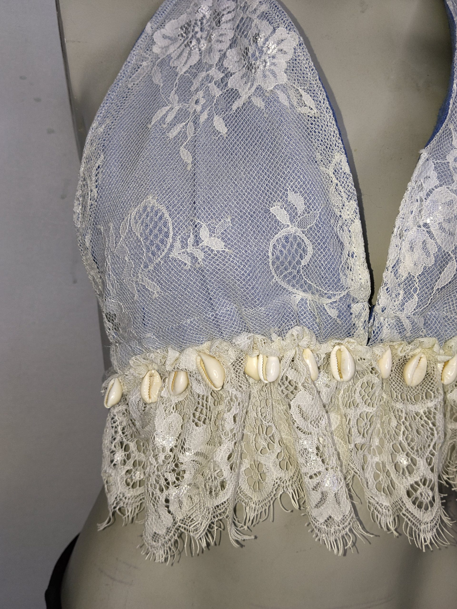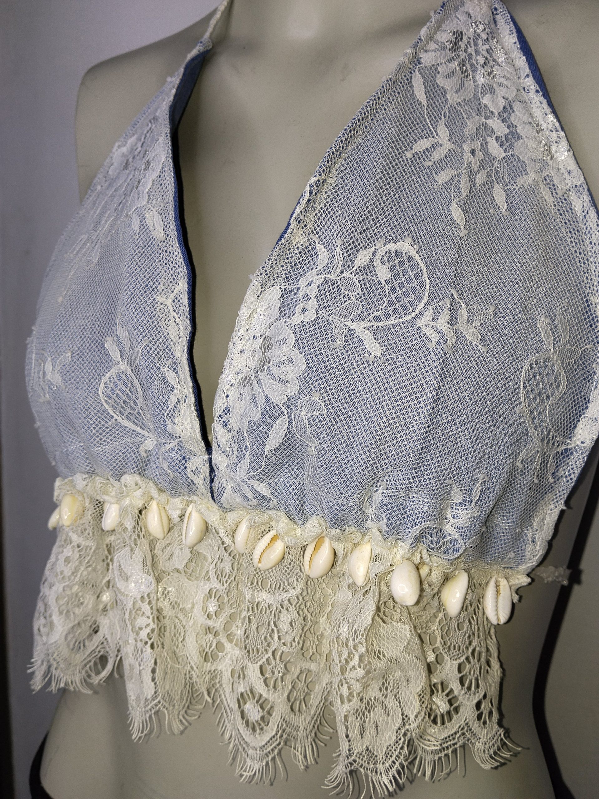 tela mezclilla, detalles encaje, conchitas colgantes